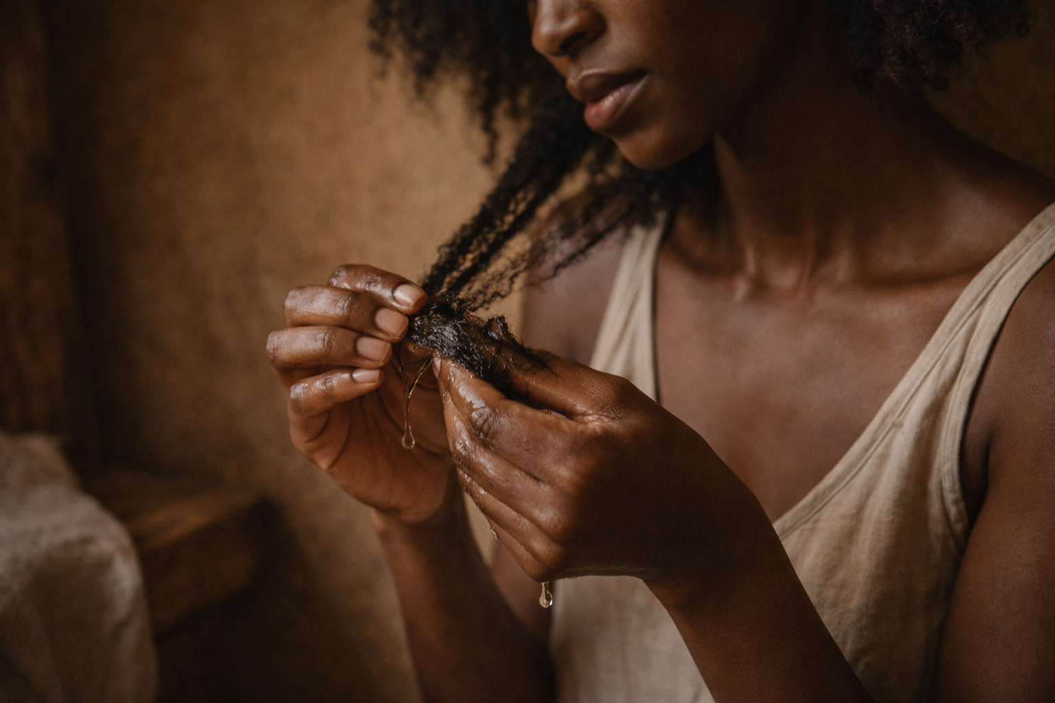 Zéya vient alors comme une continuité intelligente. Elle ne remplace pas la coco : elle empêche son geste de se disperser trop vite. Elle aide à sceller, à protéger les zones fragiles, à soutenir les pointes, là où la longueur s'interrompt souvent. Dans l'esprit Kanfura, ce rituel ne parle pas seulement de nutrition. Il parle de rétention. Il parle de ce qu'on parvient enfin à garder quand la routine devient plus juste, plus calme, plus fidèle.
