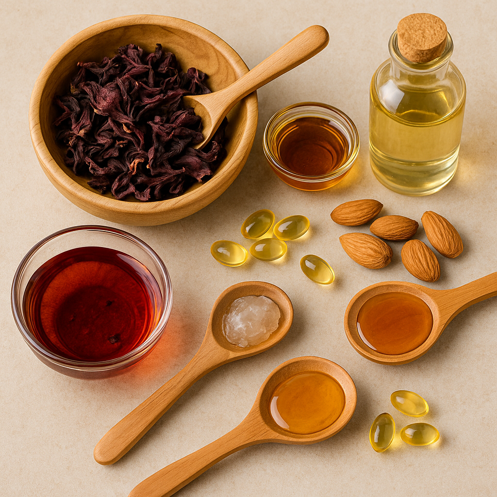 Utilise l’infusion froide d’hibiscus comme spray hydratant quotidien. Ajoute 2–3 gouttes d’huile Zéya ou une pointe de glycérine végétale pour un effet brillance instantané.