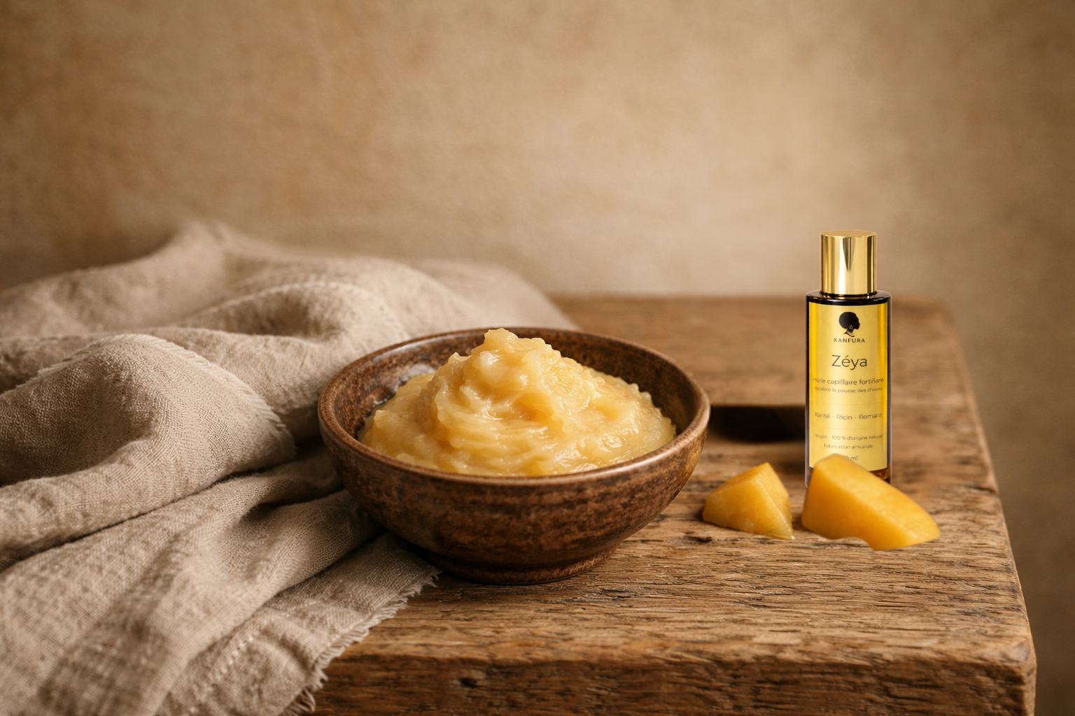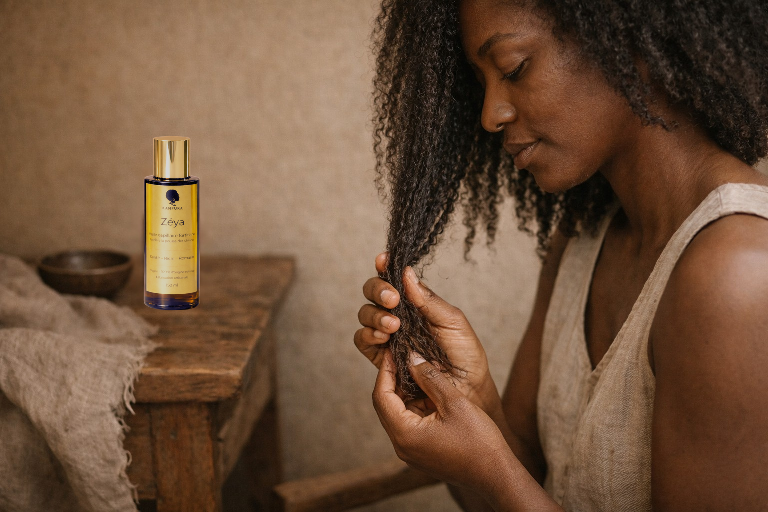 Zéya vient ensuite comme une continuité fine. Elle n'a pas pour rôle de remplacer le beurre, mais de prolonger son travail. Elle aide à sceller, à soutenir les pointes, à garder plus longtemps ce que la fibre a reçue. Dans l'esprit Kanfura, ce rituel ne parle pas seulement de nutrition. Il parle de rétention. Il parle de ce qui reste quand la routine cesse d'être brutale ou désordonnée.