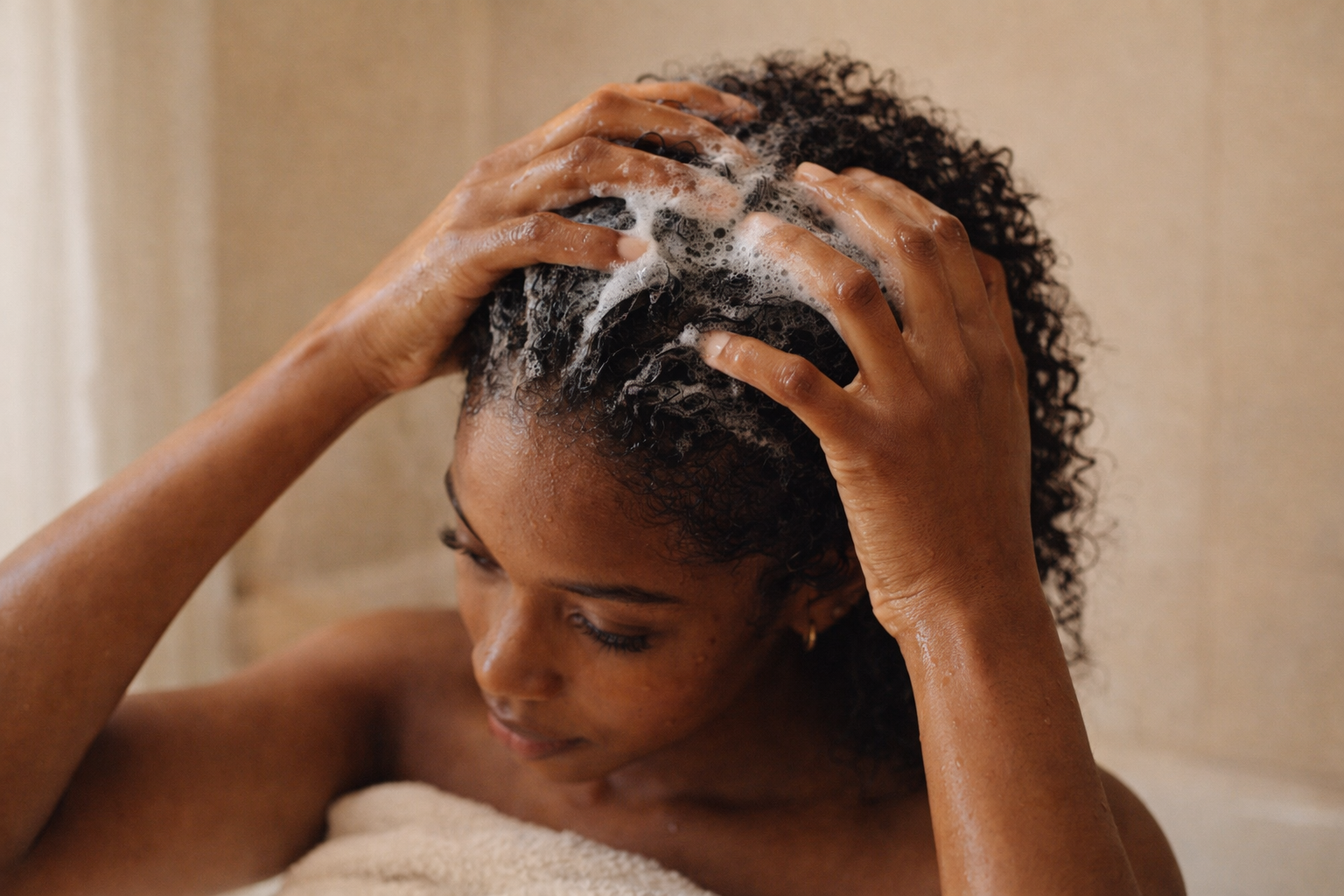 Un shampoing doux non décapant, ou un lavage traditionnel doux (ex. savon noir dilué, plantes, poudres lavantes douces).