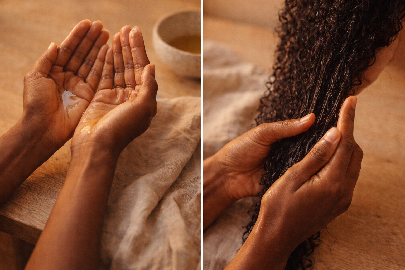Une seule matière nourrissante suffit (huile, macérât ou beurre léger), choisie pour sa compatibilité avec tes cheveux. Ici, on évite l’empilement : la simplicité fait partie du rituel.