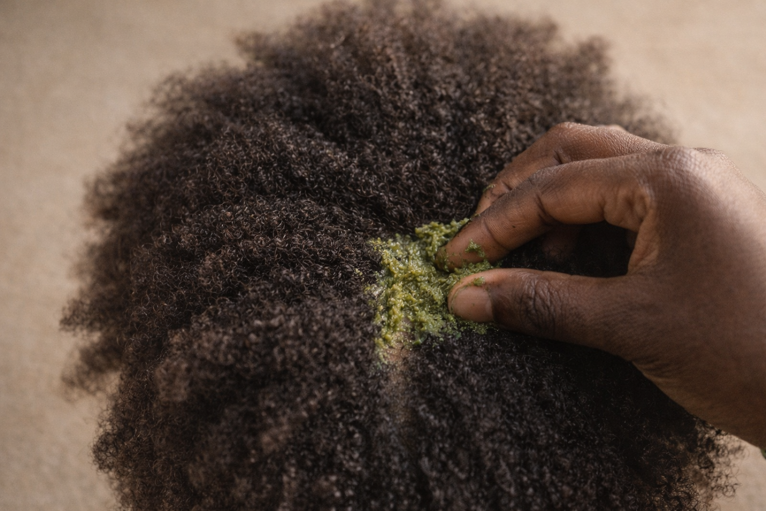 Elle est utilisée en bain de cuir chevelu, en eau de rinçage, parfois avant une coiffure protectrice. Le geste est calme. Le contact est doux. Rien n’est brusqué.