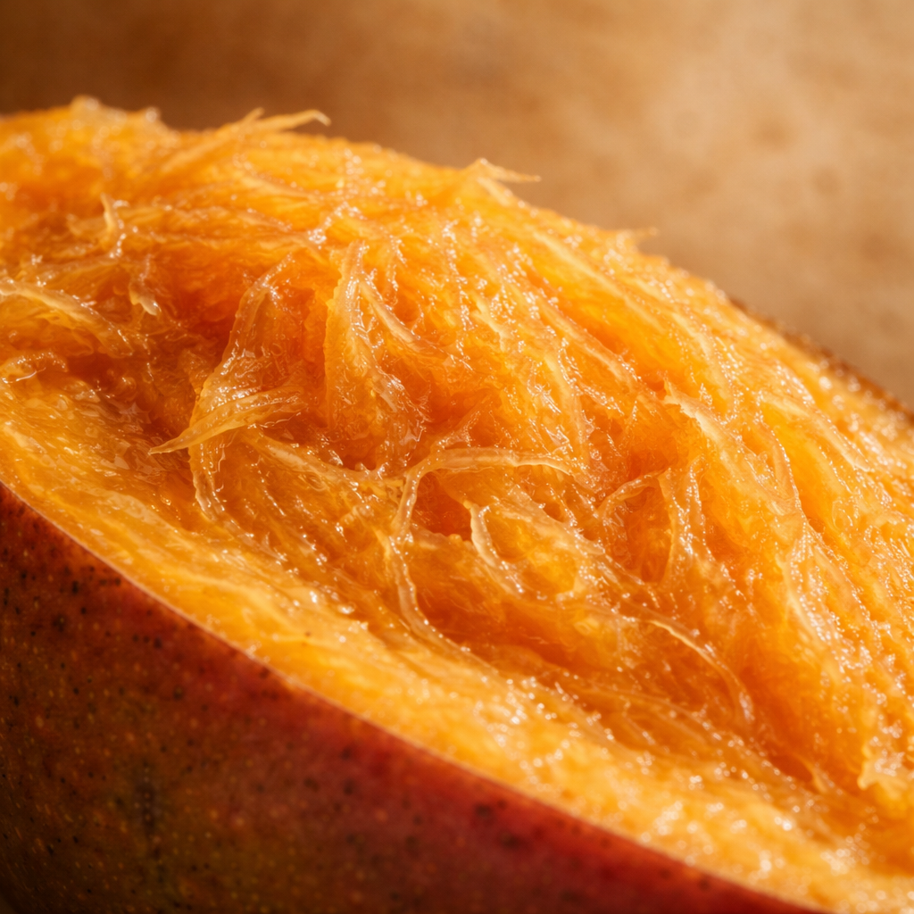 Ce qui frappe d'abord chez la mangue, c'est sa texture. Une matière souple, fondante, parfois presque veloutée. Certaines variétés sont très juteuses, d'autres plus fibreuses, mais toutes présagent cette idée de chaise riche, pleine, rassurante. La mangue contient naturellement de l'eau, des fibres, de la vitamine C, des caroténoïdes précurseurs de la vitamine A, ainsi que différents composés antioxydants.