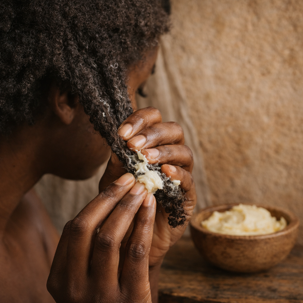 Pour les cheveux crépus, frisés ou bouclés, la longueur visible dépend moins de la pousse seule que de la capacité à préserver les longueurs déjà là. Une fibre sèche, rigide ou trop sollicitée finie par se casser avant d'avoir pu montrer tout son potentiel. C'est là qu'une matière nourrissante comme le beurre de mangue prend tout son sens.