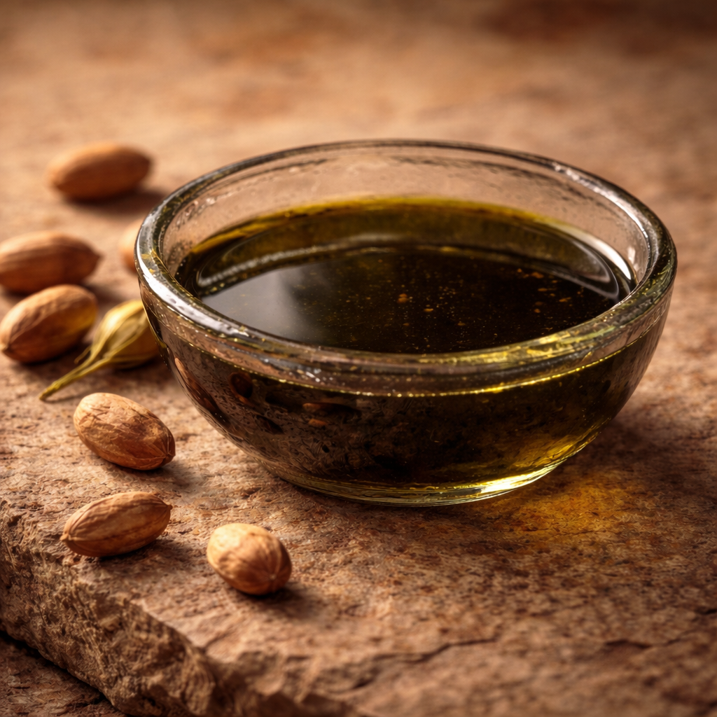 Ombre dense, odeur franche. Une huile qui ne cherche pas à séduire, mais à équilibrer. Un arbre de résistance devenu allié des cuirs chevelus exigeants.