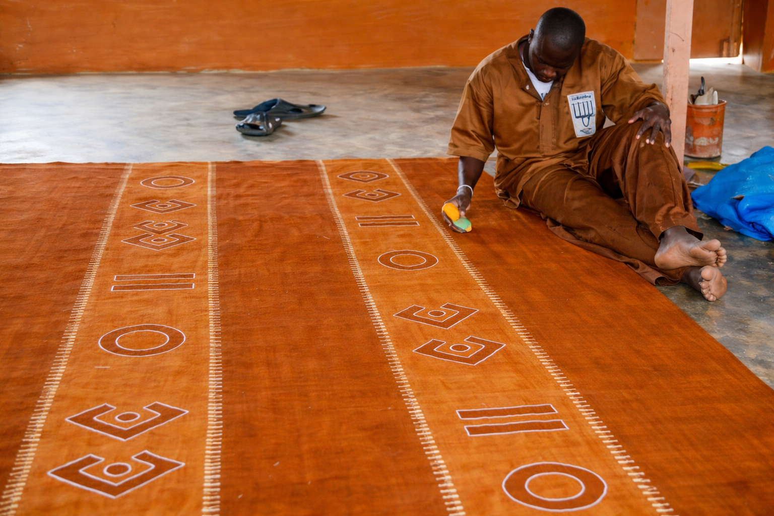 Après application, le tissu sèche — souvent au soleil — puis revient au geste. Des couches se superposent. Des aplats se renforcent. Des motifs se reprennent. Rien n’est instantané. La profondeur ne se fabrique pas dans l’urgence.