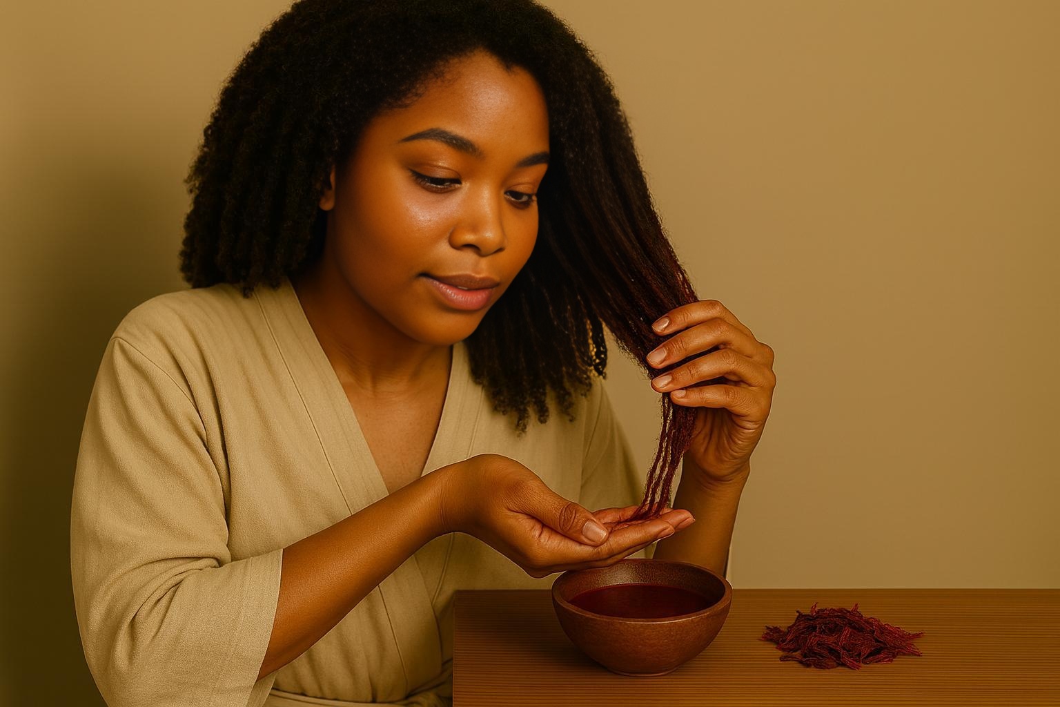 Dans ce rituel, elle devient une fleur-mémoire : elle réveille les racines, polit la fibre et laisse un éclat doux comme un matin rouge sur les terres africaines.
