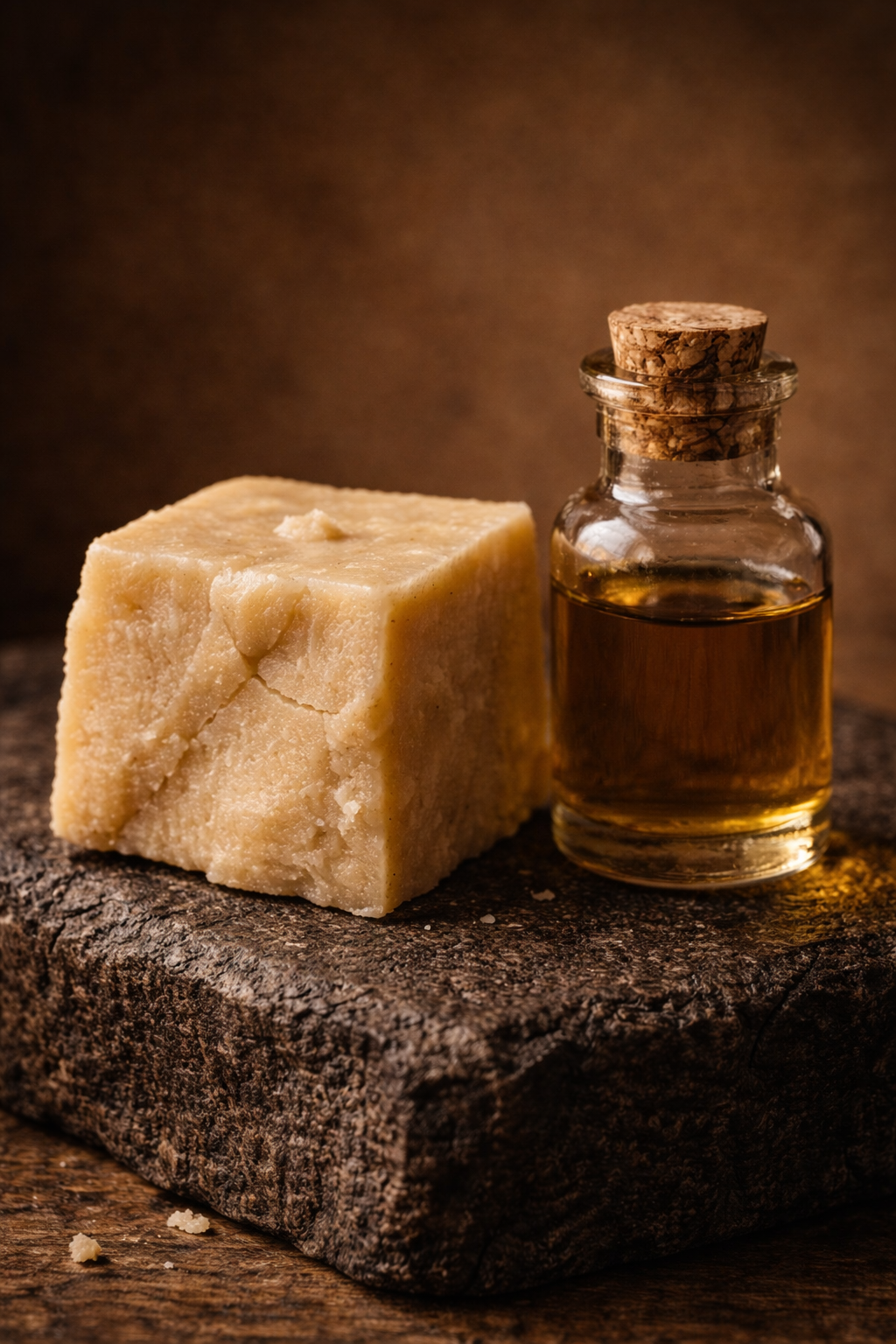 Le beurre de cacao apporte la structure. L’huile de ricin apporte la glisse et la pénétration lente.