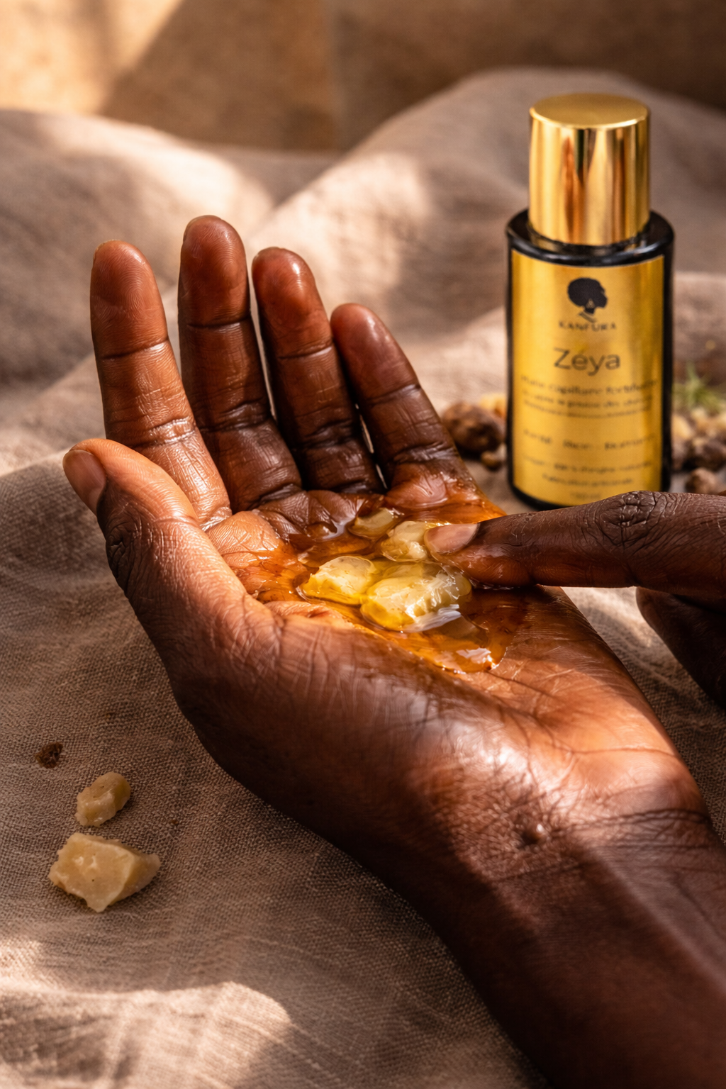 bain d’huile Zéya en amont, infusion capillaire adaptée au terrain (ex : bissap, romarin ou corossol), puis scellement cacao & ricin pour retenir sans alourdir. Explorer les Trésors d’Afrique Découvrir Zéya