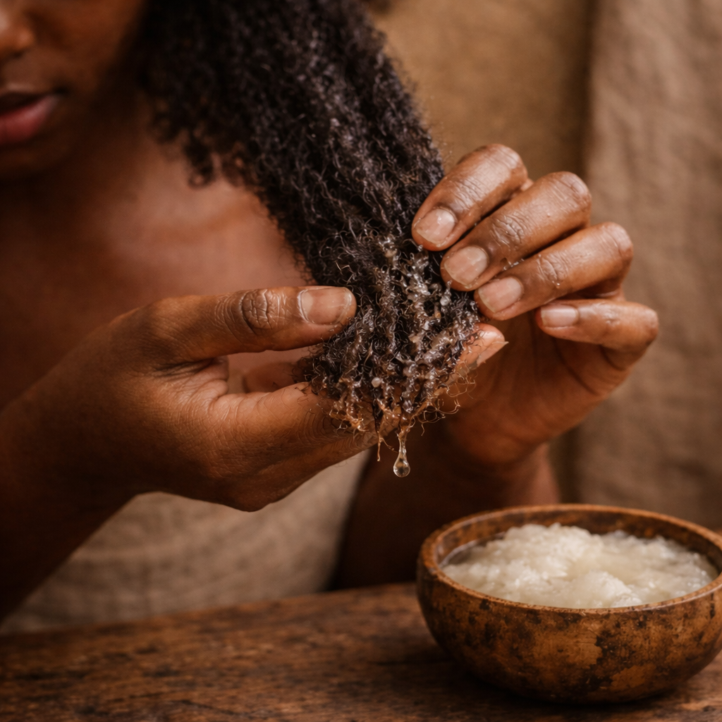 Pour les cheveux crépus, frisés ou bouclés, la longueur visible dépend rarement de la pousse seule. Elle dépend surtout de la capacité à conserver les longueurs déjà là. Un cheveu qui sèche vite, qui frotte, qui se rigidifie ou qui manque de protection fini par casser avant même d'avoir montré tout son potentiel. C'est précisément là que l'huile de coco peut prendre son sens.